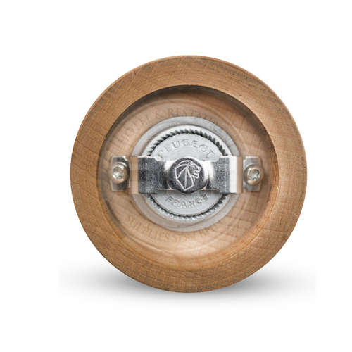 The knob located on the top of the mill, with an aged appearance and marked with the lion’s head, is used to adjust the grind of the pepper